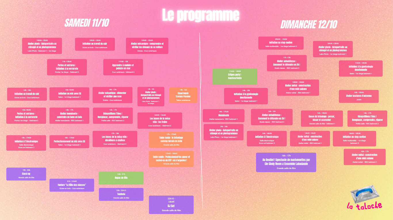 Nous nous inspirons d’autres collectifs qui ont ouvert la voie : nos grandes sœurs s’appellent La Tenaille (Montpellier), La Chignole (Marseille), La Goupille (Toulouse), La Douille (Lyon). Après elles, nous organisons La Taloche, notre festival de débrouille en mixité choisie (meufs et minorités de genre), dont la première édition se tiendra les 11 et 12 octobre 2025 à Paris, au Shakirail.